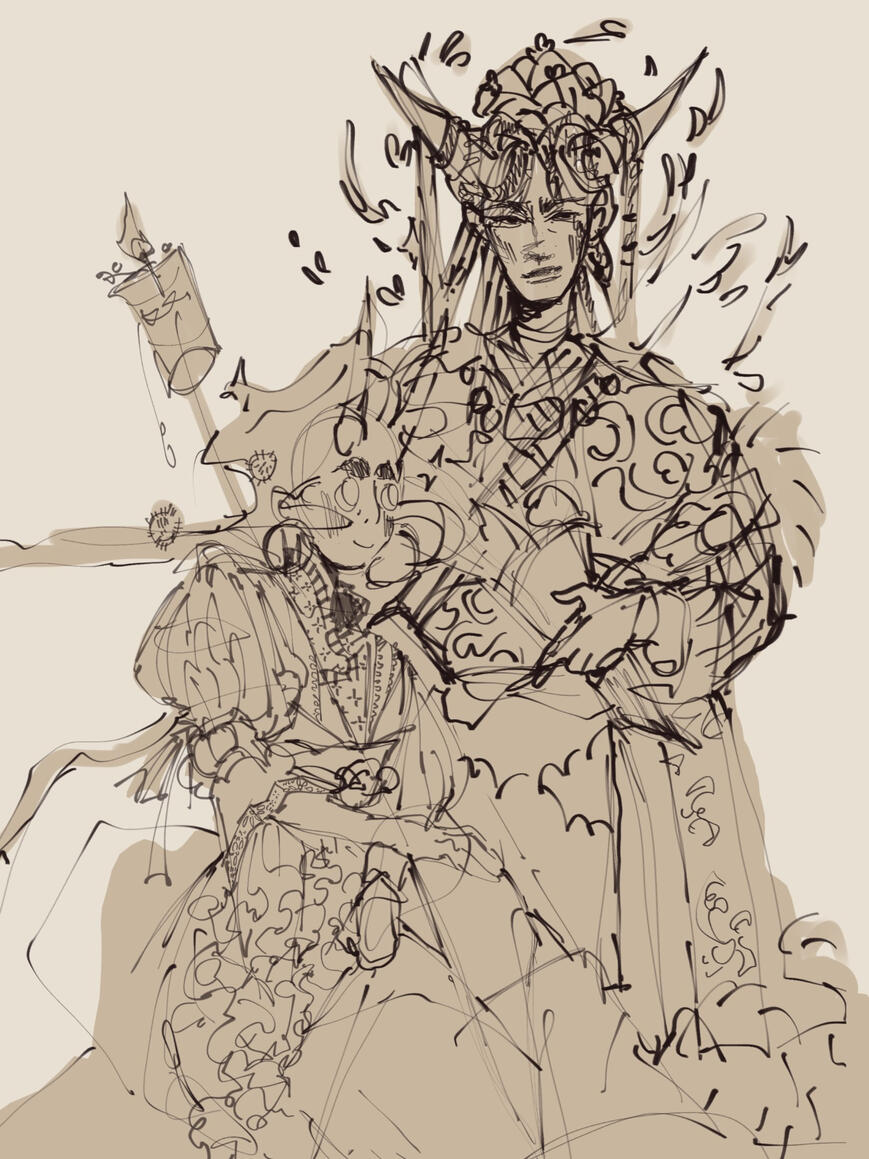 Around the age of 22 now Dawa is completely used to war strategies, negotiation meetings, going into battle and walking out with opposing side. They had learned healing magic in the meantime in order to restore mass wounded as well as heal disease along the way. Their life was violent but they were not.During the five years after Dawa’s initial kidnapping Miako was travelling with Trumeur who was getting used to his power. Trumeur could now materialize several arms consisting of a black matter akin to an animated slime like material with the sheen of metal. Physically he has undergone some changes as well. He has the distinct scent of smoke about him, smoke and ashes. His hair is long and black but when faced with an intense emotion it becomes inflamed. His face has black tattoo like patterns across it, which he calls ‘war paint’ that changes pattern with his general mood. Ability wise he is able to conjure the undead masses, necromancy as well as summon his own ‘war dogs’ which are entities forged from the same material as his arms and are semi-sentient. Trumeur, as dictated by Dawa, continued to live and is powered by hatred and hatred alone. But in order to continue living he must find Dawa and protect them because “There is no point in hating something that is dead.”Trumeur enlisted in the opposing military from Dawa’s current homestead. During the first battle he rode into he immediately summoned the undead and overpowered the enemies in one wave. Attacking the calvary that was tasked to protect Dawa during the battle he grabbed the deity and hoisted them up and made his escape with them. Returning to the monarch who held his current loyalties he announced that wherever Dawa was to go he would follow. Trumeur was named a warlord and a threat to the Motherland. He was dangerous, volatile and held powers that did not belong to him. Word of this pseudo deity spread across the land and he was generally hated by all, mortal and deity. Because of his affiliation with Dawa, the opinions of Dawa shifted to a more negative light. Nobody knew exactly why or how Trumeur had any connection to Dawa but Dawa was more than happy to explain to anyone who asked.Both Dawa and Trumeur are now 24 years old, with possibly an eternity ahead of them. Miako is also in the frey, drifting in and out of their life primarily checking on their health and happiness. Trumeur has mellowed out slightly since being reunited Dawa but still retains a grumpy and pessimistic exterior. They are still ones of war, cause war, stop wars, and start wars again. With Trumeur’s presence and intimidating air those who are thirsty for power and desire Dawa’s divinity have backed off more or less and the warring states have been on the downward spiral. Peace is slowly becoming more common but still there will be conflict as long as Dawa is alive. Dimensions begin to collide, the deities as a whole are radiating so much divine power in one place that other planes of existence are starting to feel it.Tl;dr: Basically, in this verse Dawa is a sort of ‘living war talisman’ who brings about war as well as higher probability of winning a battle. They were kidnapped from their monastery in their teenage years after saving the life of a boy named Trumeur, granting him divine powers making him a pseudo deity. Dawa has since then travelled the world with various countries and city states, on and off the battlefield, in political meetings and in strategy rooms. They still love with their whole heart but have become jaded from their life of constant turmoil, and knowing they are the one causing it. The only reason they stay alive is because Trumeur is out there still living for their sake, and living because they are alive. To take away their will would mean he would die as well. The two of them are reunited however and travel the land together as peace begins to fill their homeland once more. There is a high concentration of divine power radiating from their world that has travels past the bounds of their own dimension, seeping into others.Trivia:Trumeur is a trans man. He’s 7’2”, very muscular and covered from head to toe in scars from numerous battles. He chooses not to heal his scars although he is capable of doing so. He believes each scar he has is a sign of strength in some way shape or form. His motifs are insects, usually beetles and scorpions. Image.Miako is Dawa’s older brother figure and Trumeur’s mentor. He’s around 30 years old currently and a free spirit who cares greatly about those two. He’s laid back, mischievous, and while he seems to have loose values he’s steadfast in his beliefs and doesn’t waver when it comes to his friends and family. He’s a nature deity, has the ability to shapeshift into various animals. When he does so the animal of choice is white with golden eyes.There are several deities within this verse ranging from nearly god like to minor godlings. All the original deities share a bond similar to a familial relationship. They are all siblings. The exception being Trumeur who was born human and given deity powers by Dawa to save his life.The Motherland refers to the entire world in this context and the entire world shares the same basic religion but with varying denominations based on local beliefs and creation myths. Similar to christianity and its various denominations.